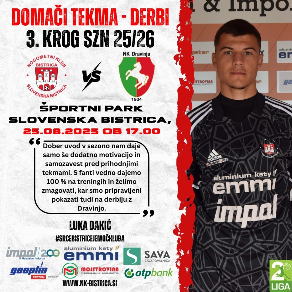 Derbi z Dravinjo bo odigran v ponedeljek, 25. avgusta, ob 17:00 v Športnem parku Slovenska Bistrica.