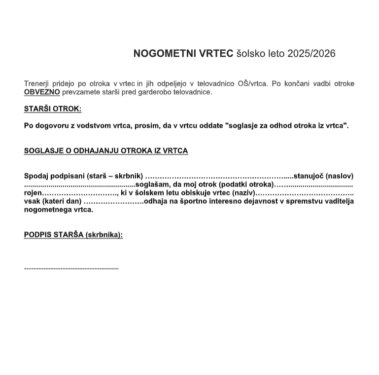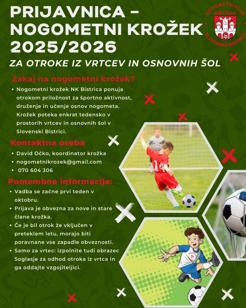 Vabljeni k vpisu v nogometni krožek – vrtec, ki se bo odvijal v času popoldanskega varstva na OŠ (1.–4. razred) in v vrtcu (5–6 let) v Slovenski Bistrici ter v 5 okoliških občinah na 26 lokacijah.