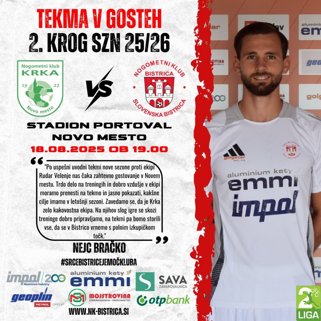 V 2. krogu naše fante čaka zahtevno gostovanje v Novem mestu, kjer se bodo pomerili z ekipo Krke. Tekma bo na sporedu v ponedeljek, 18. avgusta 2025, ob 19.00 na Stadionu Portoval.
