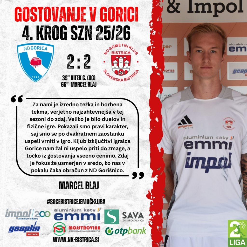 Ekipa NK Kety Emmi & Impol Bistrica je v 4. krogu 2. SNL gostovala pri ND Gorica in se po napeti tekmi razšla z remijem 2:2. V Športnem parku Nova Gorica si je obračun ogledalo približno 250 gledalcev, ki so videli dinamično srečanje z veliko priložnostmi in borbe na obeh straneh.