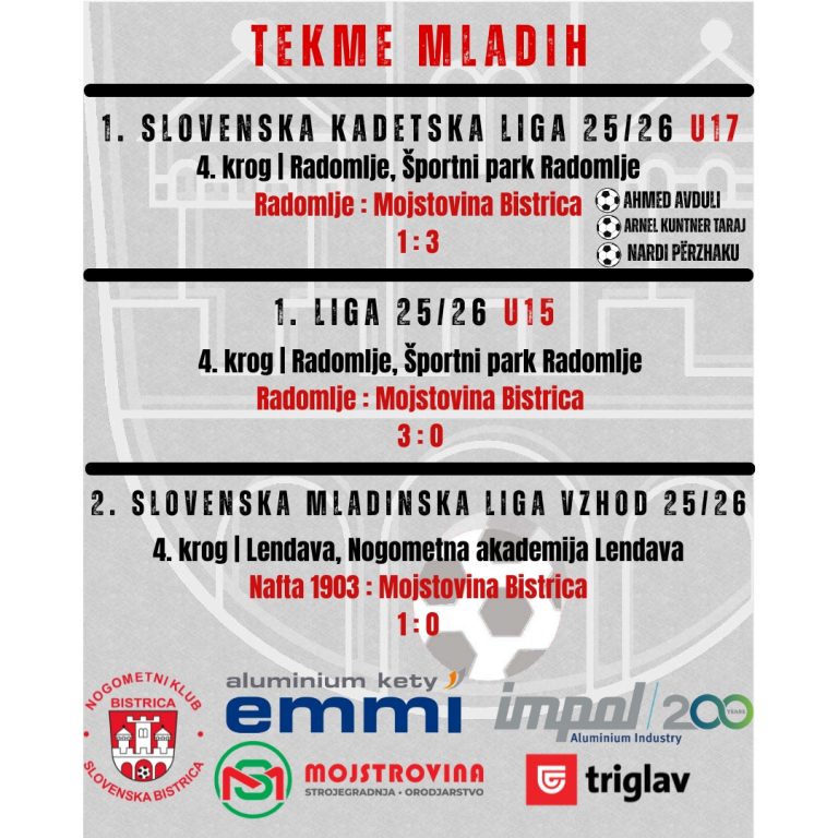 Mladinske selekcije NK Bistrica so znova dokazale borbenost – kadeti (U17) so slavili z 3:1 proti Iliriji Extra-Lux, pionirji (U15) so kljub zadetku Gala Dovnika morali priznati poraz z 1:5, medtem ko mladinska ekipa (U19) zaradi izstopa Veržeja iz tekmovanja ni stopila na igrišče.
