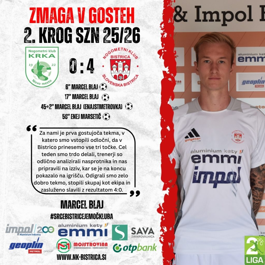V ponedeljek zvečer se je z zadnjo tekmo v Novem mestu zaključil 2. krog 2. SNL. Nogometaši NK Kety Emmi & Impol Bistrica so se pomerili z domačo Krko in se znova veselili zaslužene zmage. Z rezultatom 4:0 so dokazali, da so na začetku nove sezone v izjemni formi. Po dveh krogih imajo dve zmagi, razliko v zadetkih 7:1 in trenutno držijo prvo mesto na lestvici.