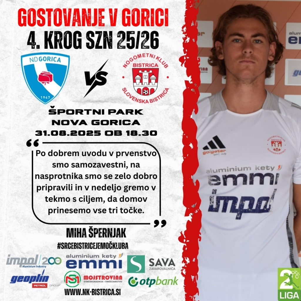 Ekipa NK Kety Emmi & Impol Bistrica bo v nedeljo, 31. avgusta, ob 18:30 odigrala tekmo 4. kroga 2. SNL. Nasprotnik bo ekipa ND Gorica, obračun pa bo potekal v Športnem parku Nova Gorica.