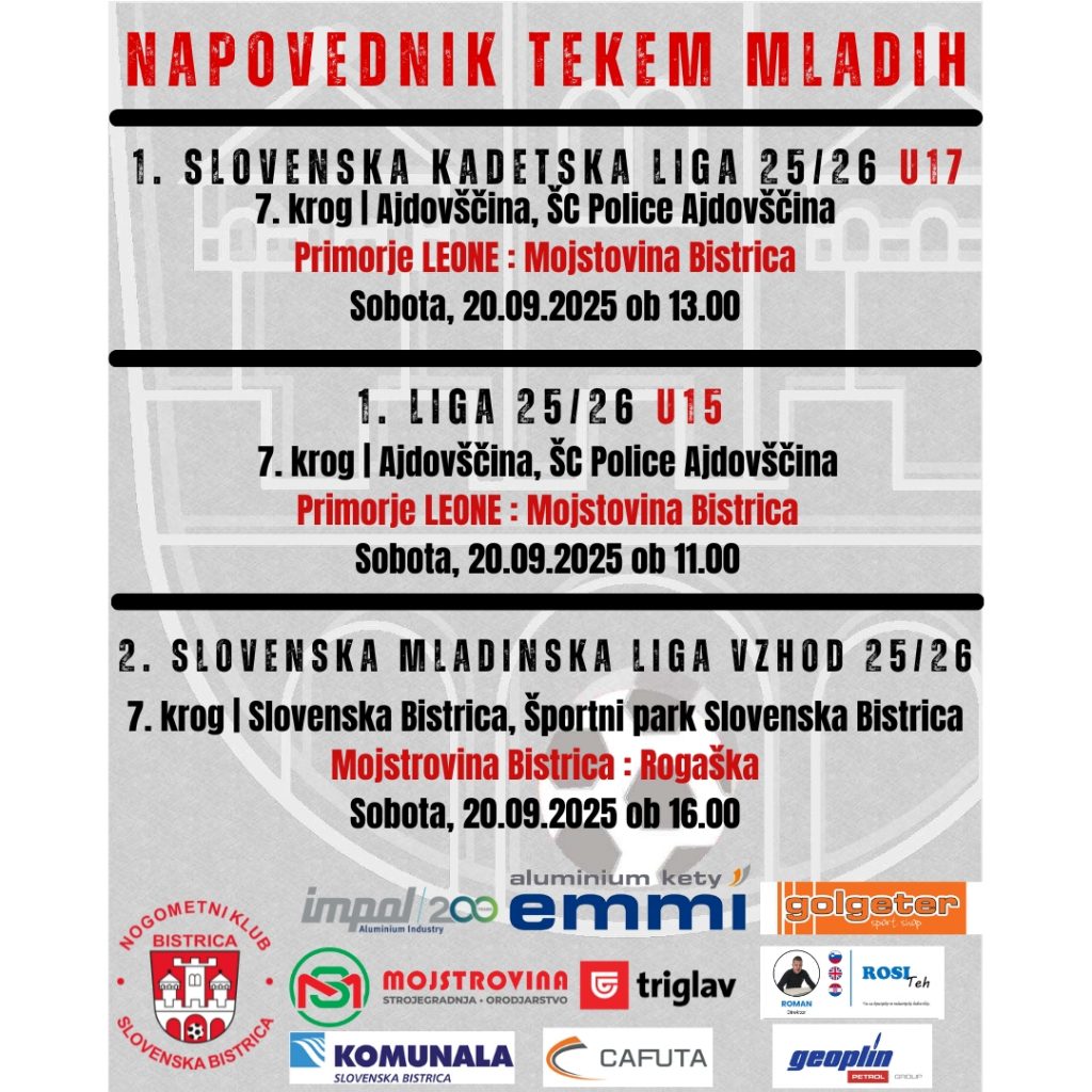 Za konec nogometnega dne bo doma v Športnem parku Slovenska Bistrica ob 16.00 na sporedu še dvoboj 2. Slovenske mladinske lige Vzhod, kjer bo naša mladinska ekipa gostila ekipo Rogaške. Pred domačimi navijači bo to odlična priložnost za prikaz atraktivne igre in lov na nove zmage.