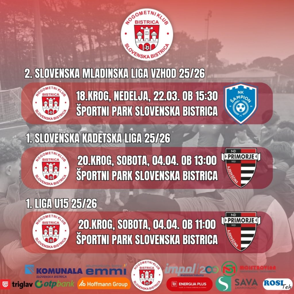 Tekmi bosta odigrani v soboto, 4. aprila 2026, prav tako v Športnem parku Slovenska Bistrica.