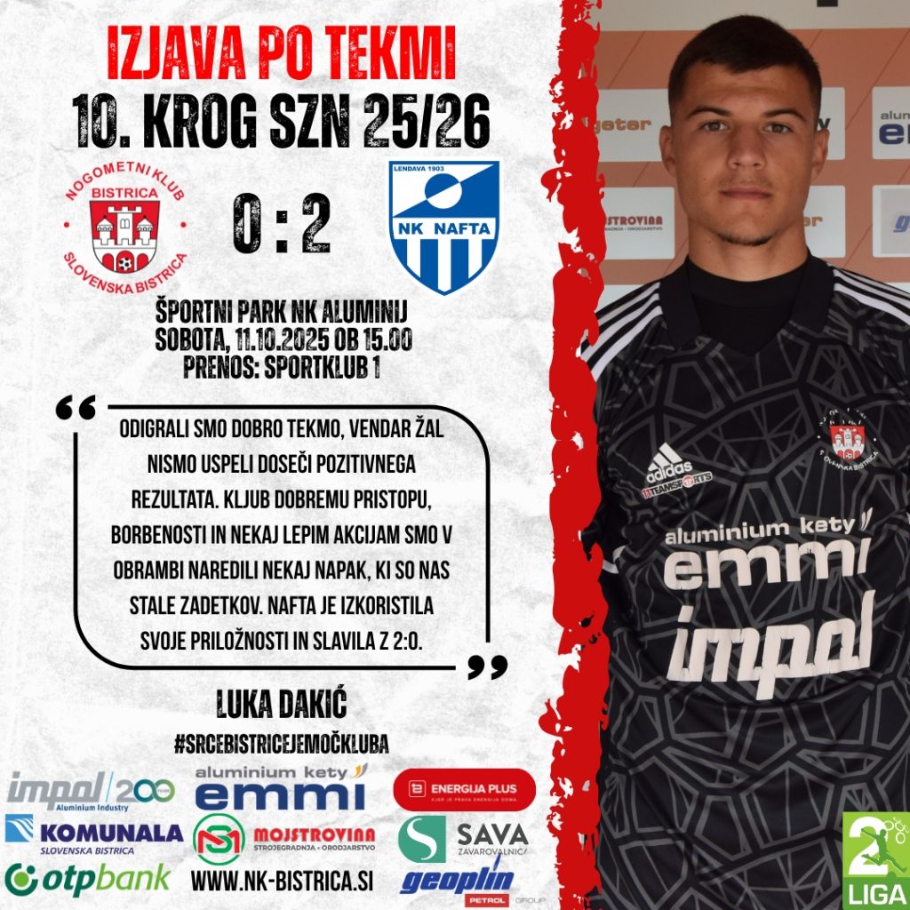 Konec srečanja je minil v znamenju prizadevanja naših nogometašev, ki so do zadnjega žvižga verjeli v preobrat. Vzdušje na tribunah je bilo odlično, navijači pa so ekipo podpirali skozi celotno tekmo in dokazali, da srce Bistrice bije močno tudi v težjih trenutkih.