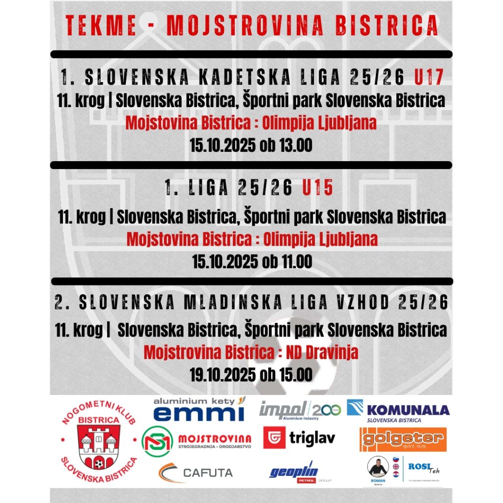 V Športnem parku Slovenska Bistrica nas čaka pravi nogometni praznik! Naši fantje iz Nogometne šole Mojstrovina Bistrica bodo ta teden doma odigrali tri pomembne tekme, ki bodo zagotovo pritegnile pozornost vseh ljubiteljev nogometa v Bistrici.