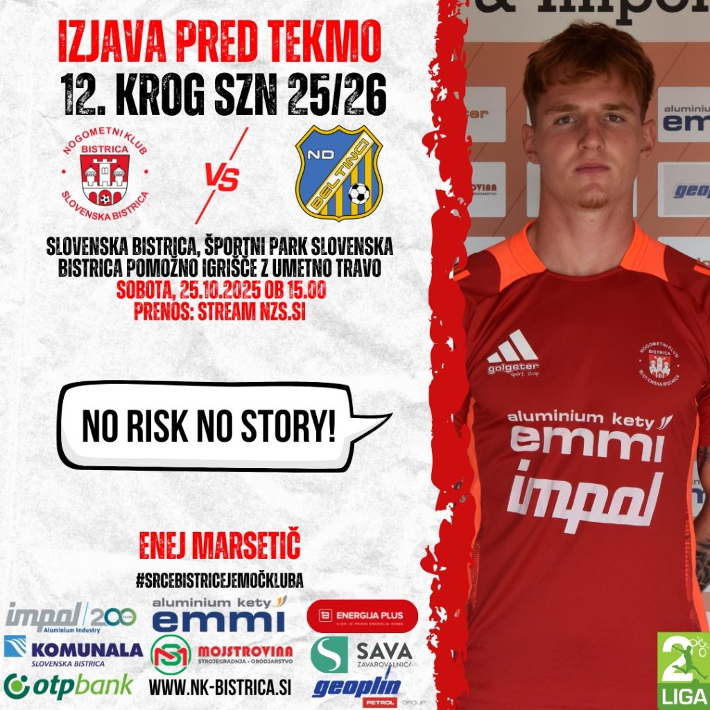 Nogometaši NK Kety Emmi & Impol Bistrica se po visoki pokalni zmagi vračajo v prvenstveni ritem. V 12. krogu 2. SNL bodo rdeče-beli v soboto, 25. oktobra 2025 ob 15. uri, na pomožnem igrišču z umetno travo v Športnem parku Slovenska Bistrica gostili ekipo Beltinci Klima Tratnjek. Tekmo bo možno spremljati tudi v prenosu na stream.nzs.si.