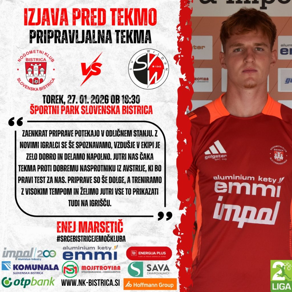 Nogometaše NK Kety Emmi & Impol Bistrica v torek, 27. januarja 2026, ob 18:30 na domačem igrišču čaka nova pripravljalna tekma. V Športnem parku Slovenska Bistrica se bodo pomerili proti ekipi SV Wildon, ki je trenutno 2. uvrščena v svoji regionalni ligi.