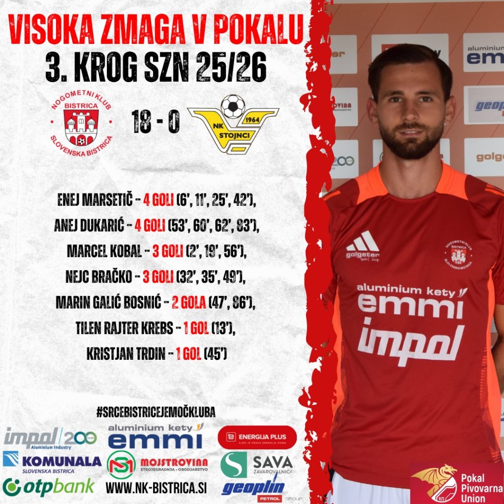 Že od prve minute so Bistričani prevladovali na igrišču, odločnost in učinkovitost pa sta prinesli rekordno zmago. Zadetke so dosegli: