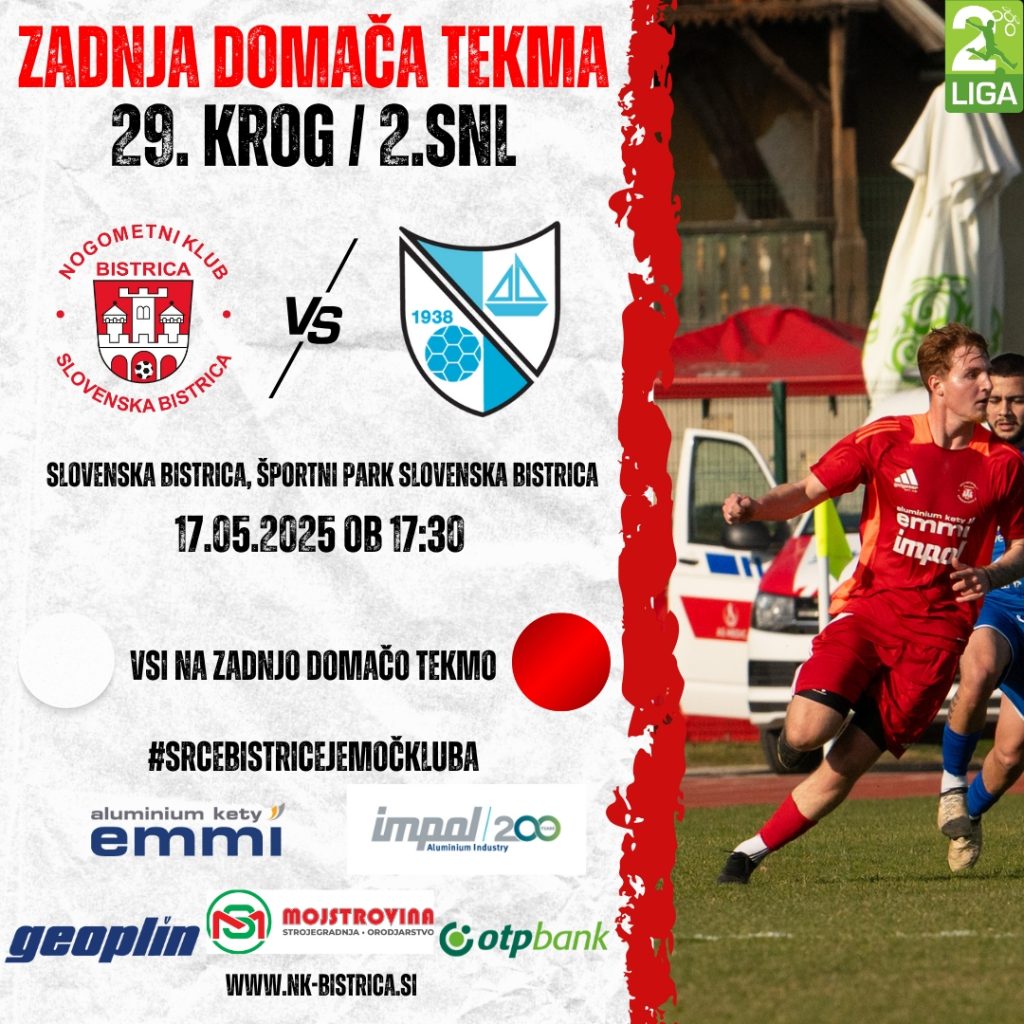 V soboto, 17. maja 2025 ob 17:30, bo Športni park Slovenska Bistrica gostil zadnjo domačo tekmo letošnje sezone. V okviru 29. kroga 2. SNL se bomo pomerili z ekipo Jadran Dekani, ki v zaključku prvenstva prav tako išče točke za čim višjo končno uvrstitev.