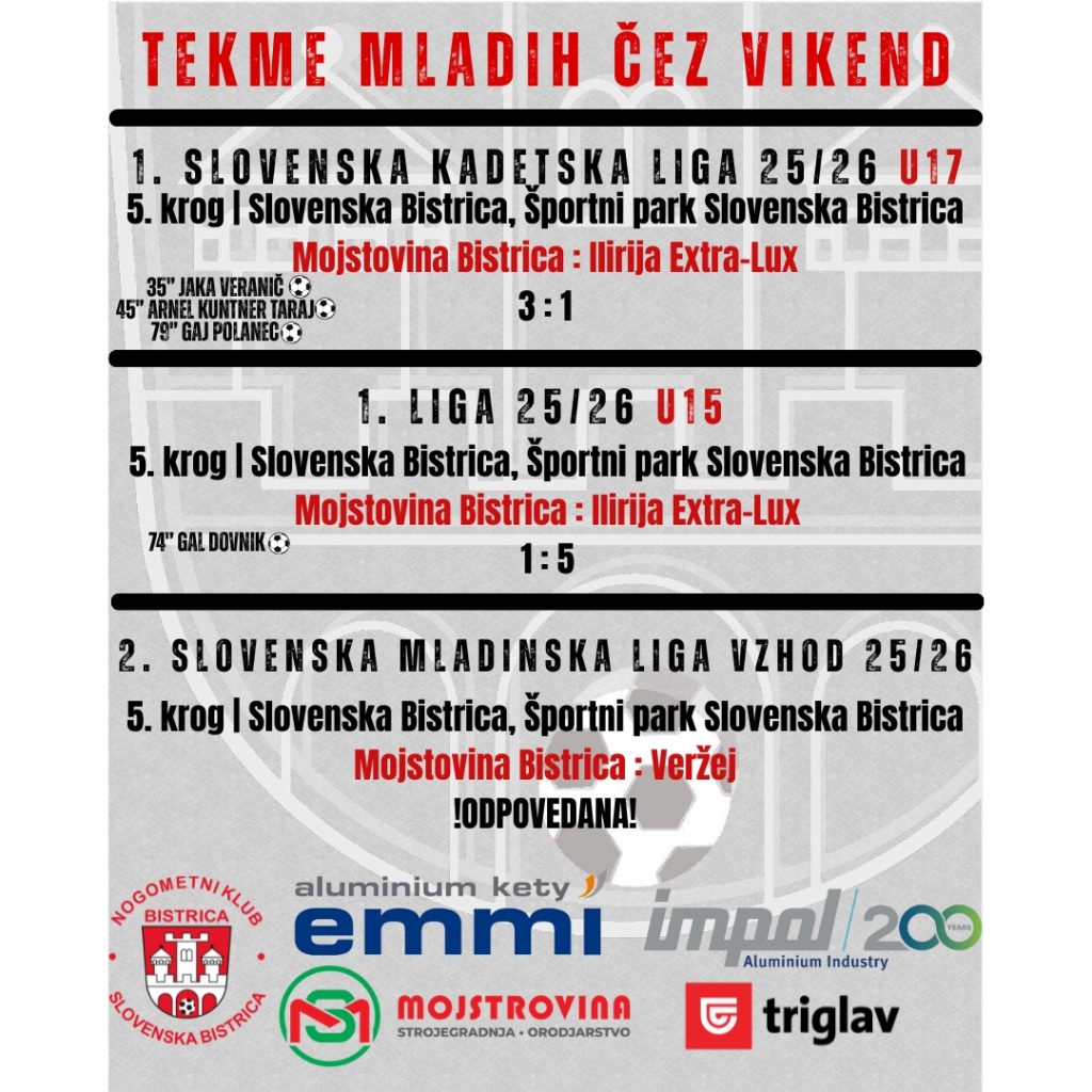 Kadetom je uspelo doseči pomembno zmago proti ekipi Ilirije Extra-Lux. V Športnem parku Slovenska Bistrica so slavili s 3:1. Za Mojstovino Bistrico so zadeli Jaka Veranič (35’), Arnel Kuntner Taraj (45’) in Gaj Polanec (79’), kar je potrdilo odlično ekipno predstavo.