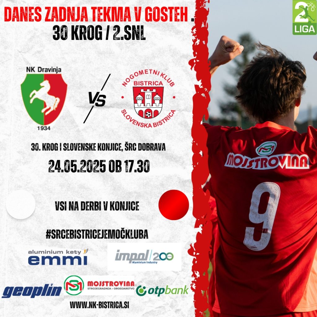 Nogometna sezona 2024/25 se danes zaključuje – in to v pravem slogu. Ekipa NK Kety Emmi & Impol Bistrica bo v 30. krogu 2. SNL gostovala pri NK Dravinja, našemu lokalnemu tekmecu iz Slovenskih Konjic. Začetek tekme bo ob 17:30 na ŠRC Dobrava.