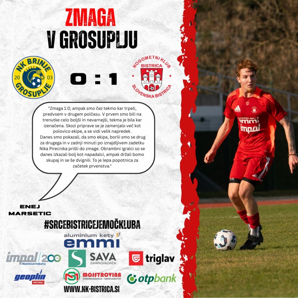 Ekipa NK Kety Emmi & Impol Bistrica je pripravljalno obdobje pred novo sezono 2. SNL sklenila na najboljši možen način – z zmago v gosteh pri drugoligašu NK Brinje Grosuplje. Edini zadetek na tekmi je v 91. minuti dosegel Nik Pirečnik, ki je bil najspretnejši po domiselni akciji in Bistričanom prinesel zasluženo zmago z 0:1.